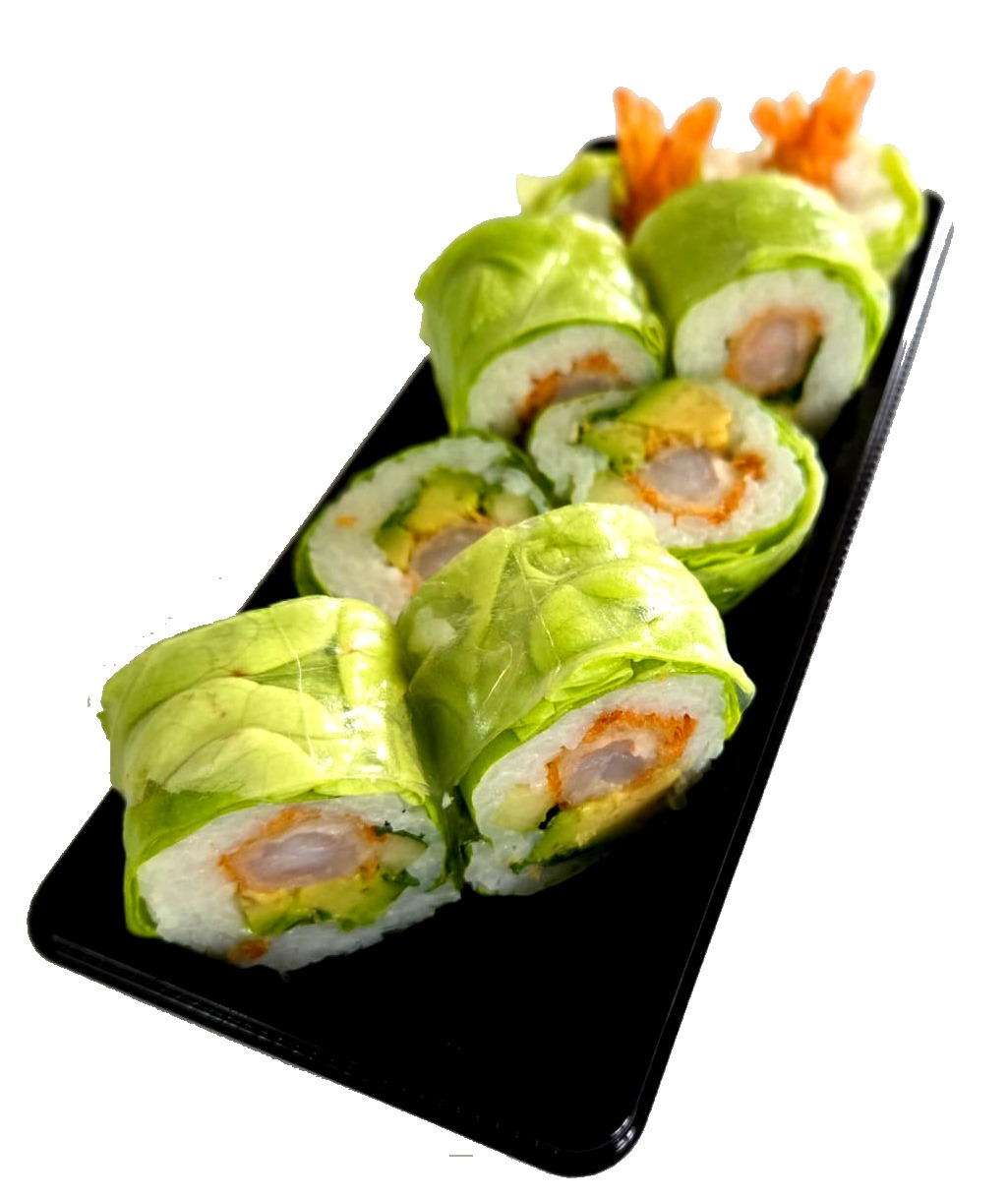 Ingredients: Galettes de riz, Riz vinaigre, Tempura crevettes, Laitue salade, Concombre, Avocat, Menthe et Coriandre